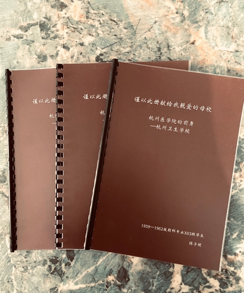 “母校竟然还有我们每个人读书时候的一寸照!我都没有这张照片啦!”陈子明校友激动的翻看着纪念册,嘴里不住的说着:“这份纪念册真是太宝贵了”。64年前,陈子明校友在看到浙江省杭州卫生学校(简称“杭卫”)招收放射科专业的招生启事后,开心的不得了,觉得这个专业非常有趣,非常适合喜欢手工制作的自己,就此与母校结缘。在校三年期间,陈子明校友感触最深的有两点,一是学校校风学风非常好,老师们不仅专业教学过硬,更是无微不至的关怀他们,如同妈妈般的班主任盛端芬老师、干脆利落的解剖学李冠芳老师、严谨认真的物理吴老师,这些关怀与教育帮助他们树立了正确的人生观、世界观、价值观。第二是学校特别注重各种实践活动,如轮流到学校药厂劳动,剥大蒜制作大蒜注射液的劳动实习;到临浦开展教育实习;到湖州进行生产实习;毕业后到温州平阳除病防害,挨家挨户给村民打预防针,到安吉晚上8点后给村民抽耳朵血查疟疾、丝虫病的社会实习,这些实习让处于人生起步阶段的学生很早的接触社会,尤其是社会实习过程中的酷热难耐、农民家里打地铺、伙食很差只能吃酸菜、医疗用品严重不足等困难,锤炼了他们吃苦耐劳的高贵品质,并促进他们及时将学的知识应用到实践上,帮助他们在毕业后很快与社会工作接轨。