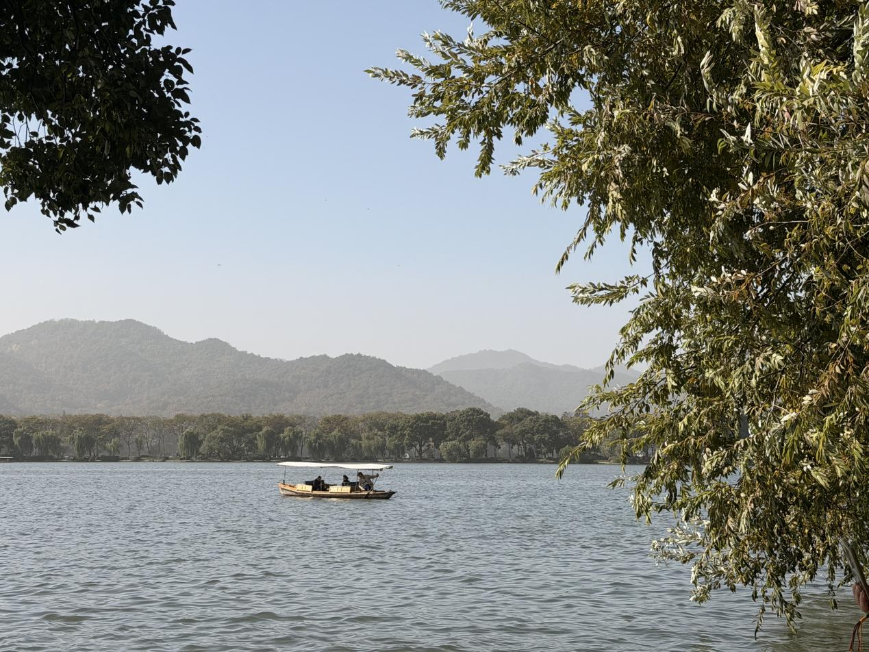 活动当日上午,阳光和煦,秋风送爽。大家齐聚西湖码头,乘一叶画舫,悠然荡于碧波之上。湖光山色如卷轴般在眼前徐徐展开,苏堤春晓的绿意未消,雷峰塔影倒映水中,平添几分诗意。教职工或凭栏远眺,沉醉于“三面云山一面城”的秋日画卷;或举起手机定格美景,与身旁同事分享眼前的惬意;偶尔传来几句关于西湖传说的闲聊,笑声与水波声交织,沉醉于西湖独特的秋日韵味之中,感受着“水光潋滟晴方好”的惬意与闲适。
