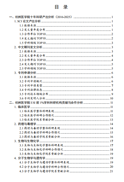 专题研究报告:完成了“ESI前1%学科机构贡献与合作分析”、“杭医专利申请分析” 等多份深度分析报告。编撰完成品牌产品《杭医图情专刊》2期,尤其是在建校百年之际推出的第11期图情专刊,系统分析了学校十年的科研产出与合作轨迹,让学科布局与科研决策有 “数” 可依!
