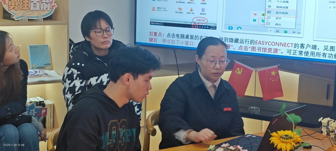为深入推进“我为师生办实事”实践活动走深走实,切实解决学生在使用图书馆数据资源中遇到的“最后一公里”问题,2025年11月28日中午,图书馆(档案馆)暨机关第十二党支部组织党员走进一站式学生社区,开展了以“服务面对面,数据送到寝”为主题的特色党日活动。