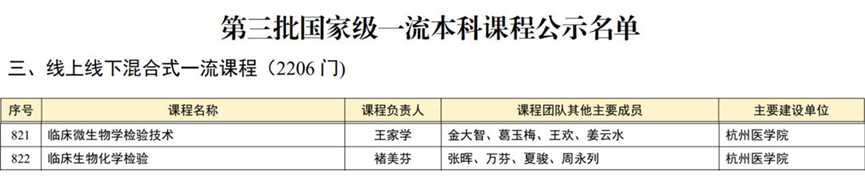 近日,教育部正式公布了第三批国家级一流本科课程认定结果,检验医学院、生物工程学院申报的2门线上线下混合式课程成功入选,分别是褚美芬教授主持的《临床生物化学检验》与王家学副教授主持的《临床微生物学检验技术》。这是学院继《临床分子生物学检验技术》入选国一流课程后,在课程建设领域取得的又一重大突破,标志着学院国家级一流课程群建设迈上了新台阶。