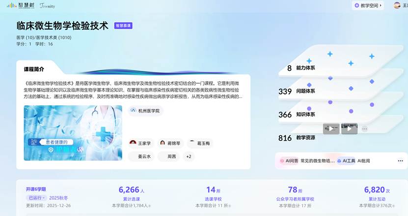《临床微生物学检验技术》课程秉持“以学生成长为中心” 的教学理念,历经多年系统化、阶梯式建设,已逐步发展成为一门资源体系完整、辐射广泛、教学互动活跃的优质课程。课程自2016年由王家学老师牵头启动建设以来,持续推动教学创新与资源迭代,逐步实现从SPOC平台(2019)、省级线上一流课程(2020)、省级课程思政示范课程(2022)到MOOC与知识图谱双平台上线(2023)的跨越,并于2025年成功获评为线上线下混合式国家级一流本科课程。课程依托智慧教学平台已平稳运行6个教学周期,累计选课6,266人,覆盖全国78所高校,互动量达6,820次。课程紧密对接“新医科”建设要求,以成果导向教育(OBE)理念,构建了涵盖8大能力维度、339个问题单元、366个知识节点与816项教学资源的立体化课程体系。通过融合临床案例、知识图谱与虚拟仿真项目等数字化资源,开展以真实情境为导向的翻转课堂与探究式学习。课程已累计建设了微视频近300分钟,建成了课程思政案例,并开展了多轮线上线下混合式教学,教学成效获得校内外师生与行业专家的广泛认可。展望未来,课程将继续深化教学实践,积极探索智慧课程升级、人工智能交叉课程建设、虚拟仿真资源拓展等创新路径,持续推动课程内涵发展,助力培养具有扎实专业能力、临床思维与人文素养的新时代高素质应用型医学检验人才。