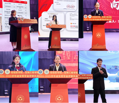 现场评审环节,由医检2304班宋烨莎、医检2201班翟华倩、医检2408班吴佳乐、医检2203班沈楠、生物2201班张苧尹、卫检2202班陆心欣共六位迪安一、二等奖候选人进行现场展示,这些经历层层选拔的优秀学子,将围绕专业学习、科研创新、荣誉奖励及综合素质等方面进行汇报答辩,最终由评委老师现场评分。