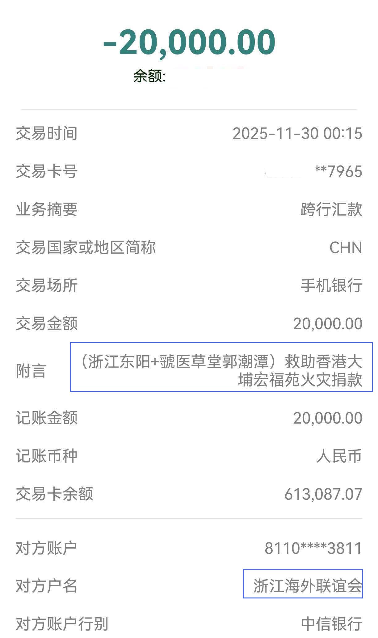 近期,香港新界大埔区宏福苑发生重大火灾事故,造成大量人员伤亡与财产损失,灾情牵动着全国人民的心。危难时刻见真情,民盟杭州医学院支部盟员郭潮潭研究员心系香港受灾同胞,通过海外联谊会定向捐赠人民币贰万元,以实际行动为香港灾民送去温暖与关怀,助力灾后救援与安置工作。