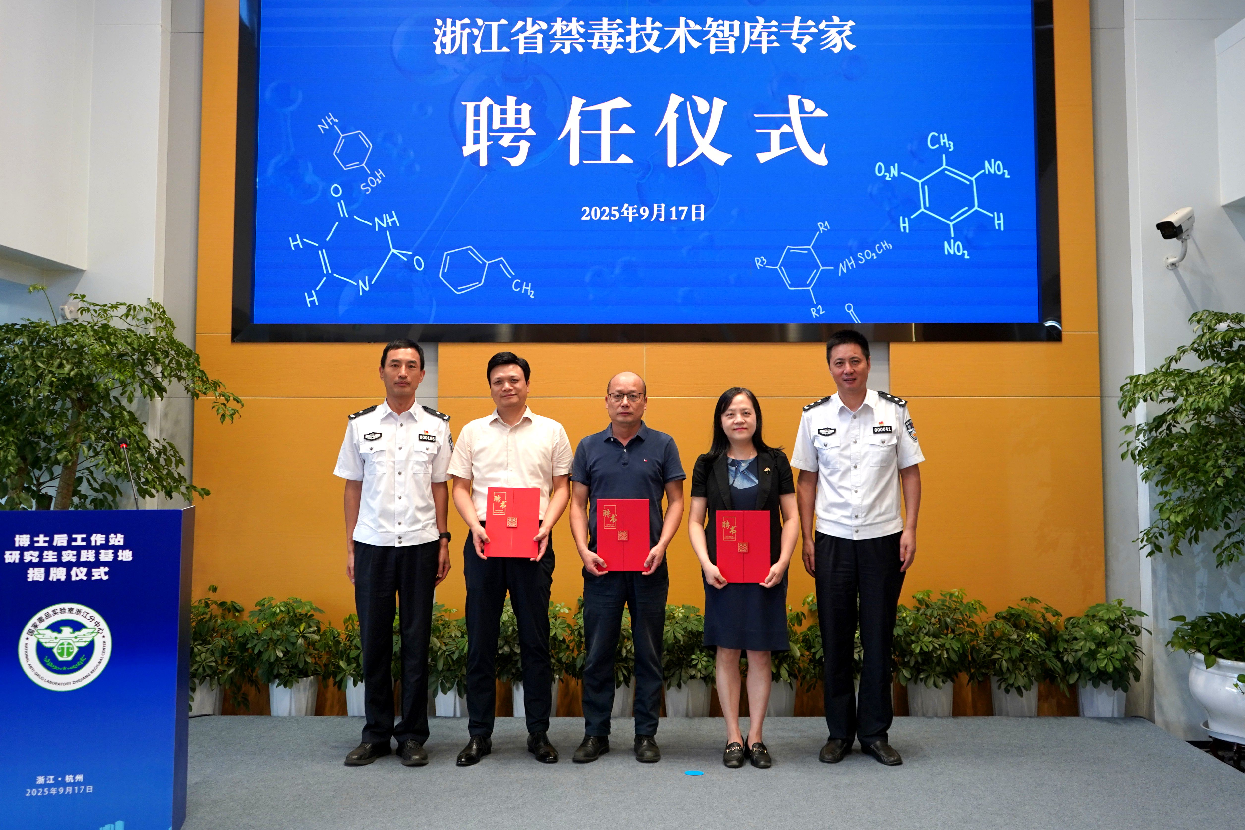 会上,浙江省公安厅副厅长聂展云、浙江警察学院党委书记蒋建森与杭州医学院校长梁广、中国药科大学副校长丁锦希共同为“研究生实践基地”揭牌并分别讲话,两位校长均表达了对禁毒科技创新和人才培养工作的支持,同时还举行了浙江省禁毒技术智库专家聘任仪式。
