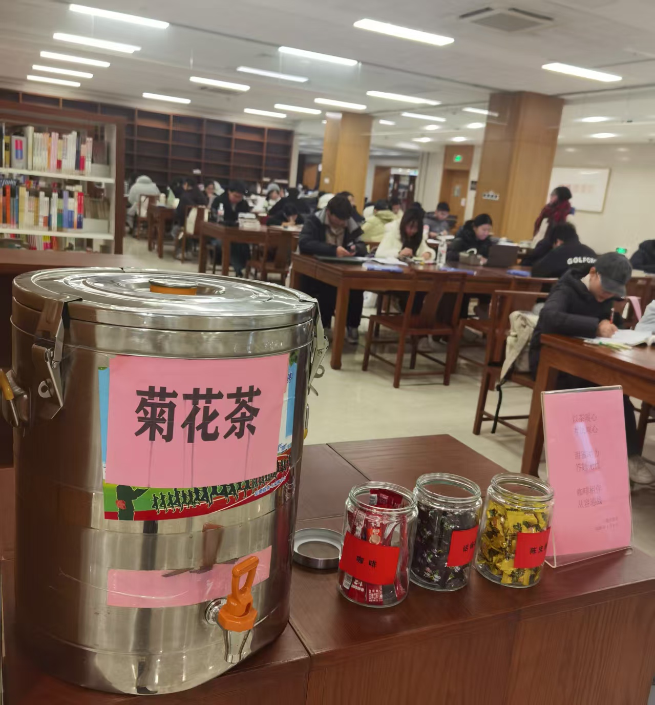 如今,这份关怀已全面覆盖各主要学习空间。在图书馆的每个楼层、6号与13号教学楼的大厅以及24小时自修室,均设立了统一的“暖心补给站”。站内备有清润明目的菊花茶、提神暖心的速溶咖啡,以及陈皮糖、话梅糖等小食,为同学们提供及时的能量补充与情绪调节。
