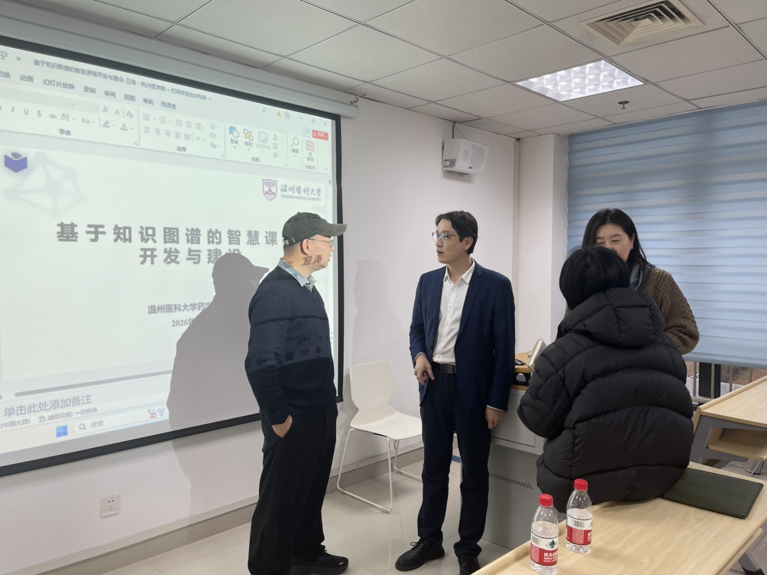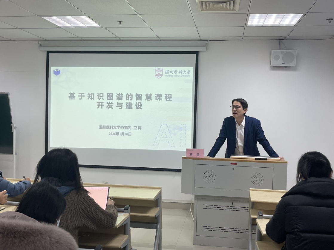 为深入推进教育数字化转型,积极探索人工智能与药学学科教育深度融合的创新路径,2026年1月20日下午,药学院、食品科学与工程学院邀请温州医科大学药学院副院长卫涛教授,开展以“基于知识图谱的智慧课程开发与建设”为主题的专题讲座。活动由学院副院长孙培蓓主持,院长施菁及学院参与教学工作的教师共同参加。