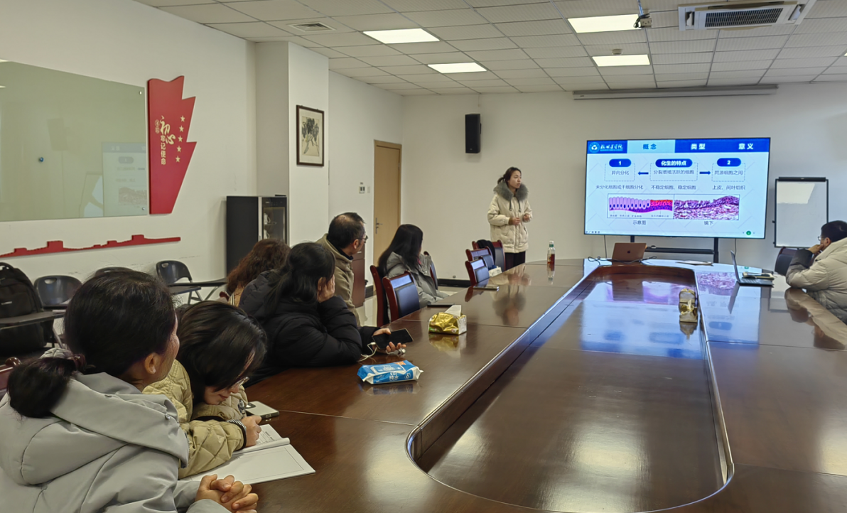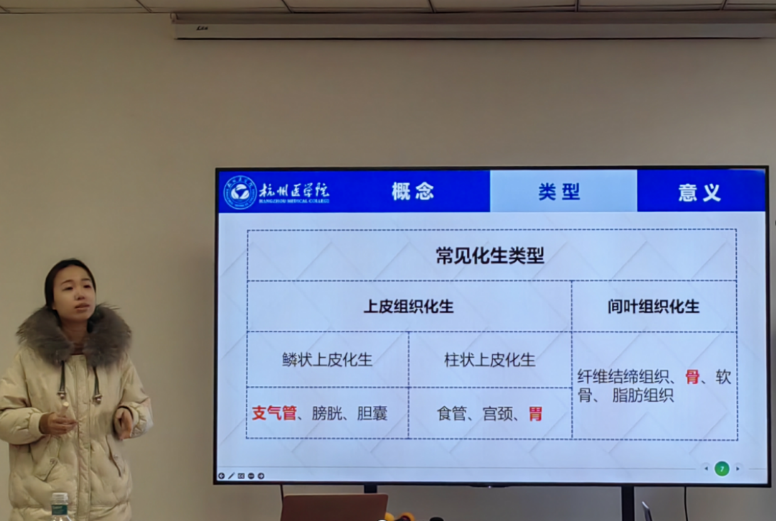 来自病理学与病理生理学教研室的朱芝漫博士则围绕《病理生理学》课程中细胞化生部分的内容开展了理论课试讲。朱老师紧密联系临床案例,图文并茂地讲解了细胞化生的概念、常见类型和临床意义,同时也注重课程思政的融入和课堂互动的设计,内容丰富,重点突出。