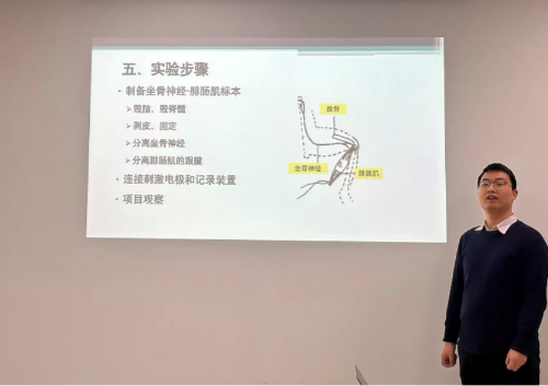 试讲环节中,两位新教师分别结合自己下学期即将开讲的课程,充分展示了自己的备课成果和教学风采。来自生理学教研室的邱石桥博士紧扣《生理学》教学大纲就“不同刺激强度和频率对骨骼肌收缩形式的影响”这一内容开展实验课教学的试讲。邱老师系统讲解了实验原理、操作步骤及注意事项,并有机融入实验动物伦理等课程思政内容。同时,他还注重紧密结合自身科研经历,引导学生初步建立生理科学实验规范意识与基础医学科研思维,讲解清晰,逻辑严整。
