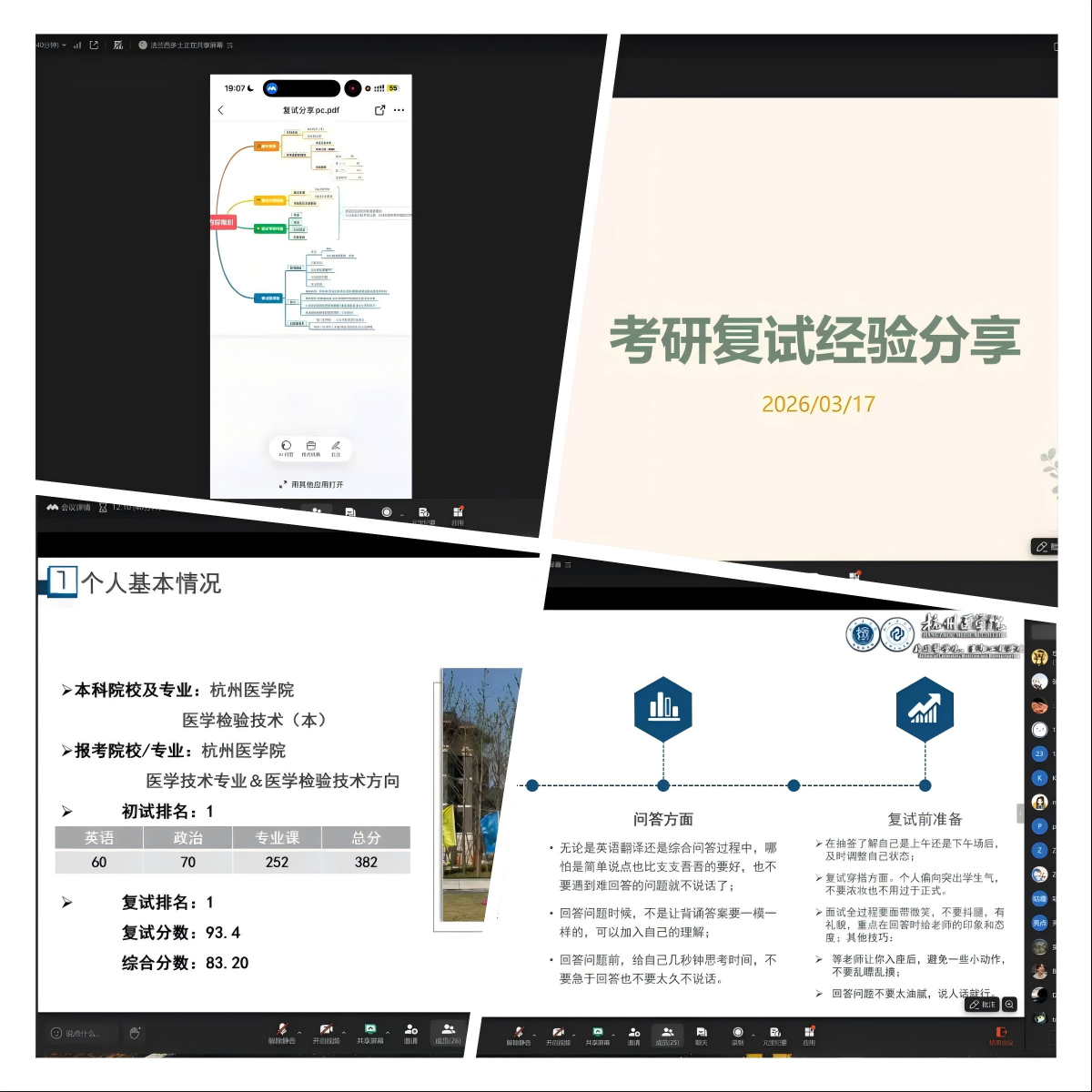 此次线上考研经验分享会打破时空限制,内容务实、干货满满,既为学子们搭建了经验交流的平台,也为考研冲刺阶段提供了精准指导。未来,检验医学院、生物工程学院将持续聚焦学子升学需求,以全方位、精细化的服务助力学子圆梦研途,不断提升学院人才培养质量与升学工作成效。(文/褚洪坤,图/褚洪坤,初审/陈阳阳,终审/宋广忠)