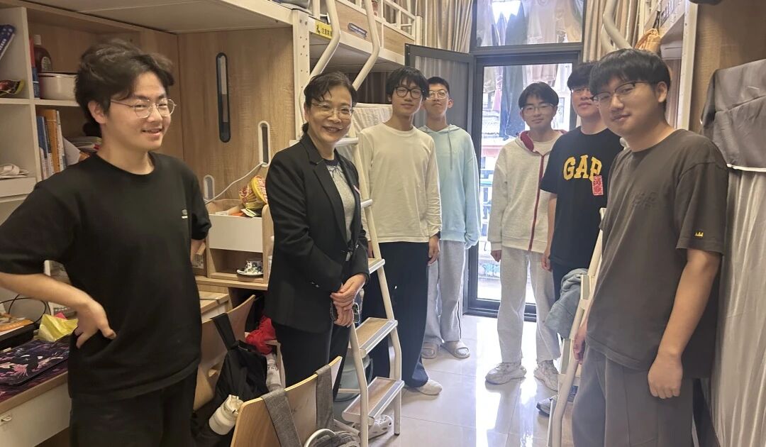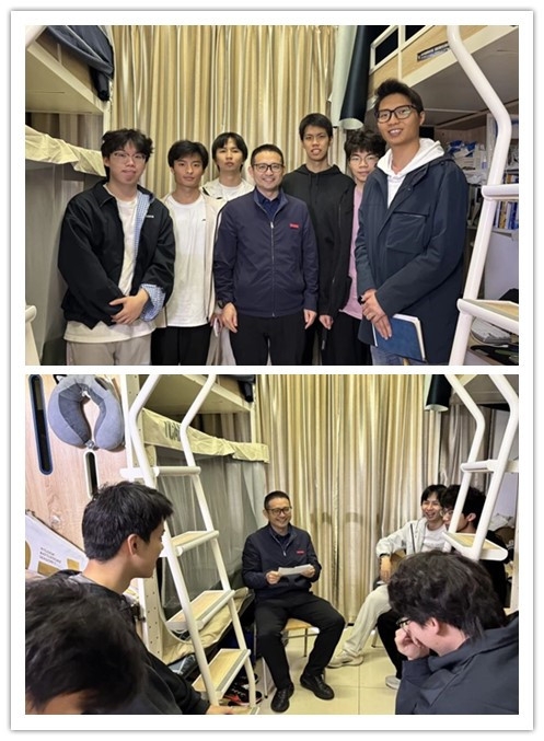 校长办公室副主任李钦细致了解每位同学的性格、爱好,在拉家常式的轻松交流中,关心了解学习安排、周边饮食情况,叮嘱同学们互助互谅、共建和谐寝室,在整洁有序的环境中温暖向上。