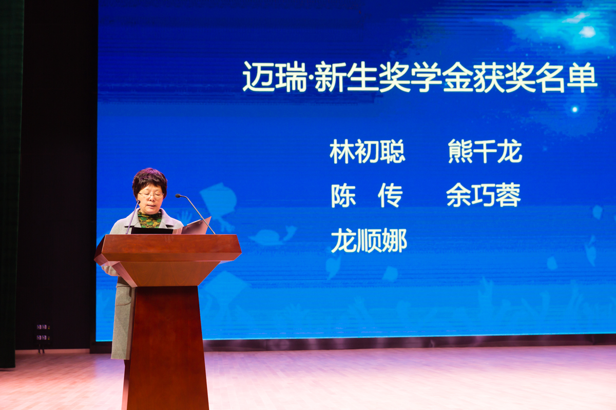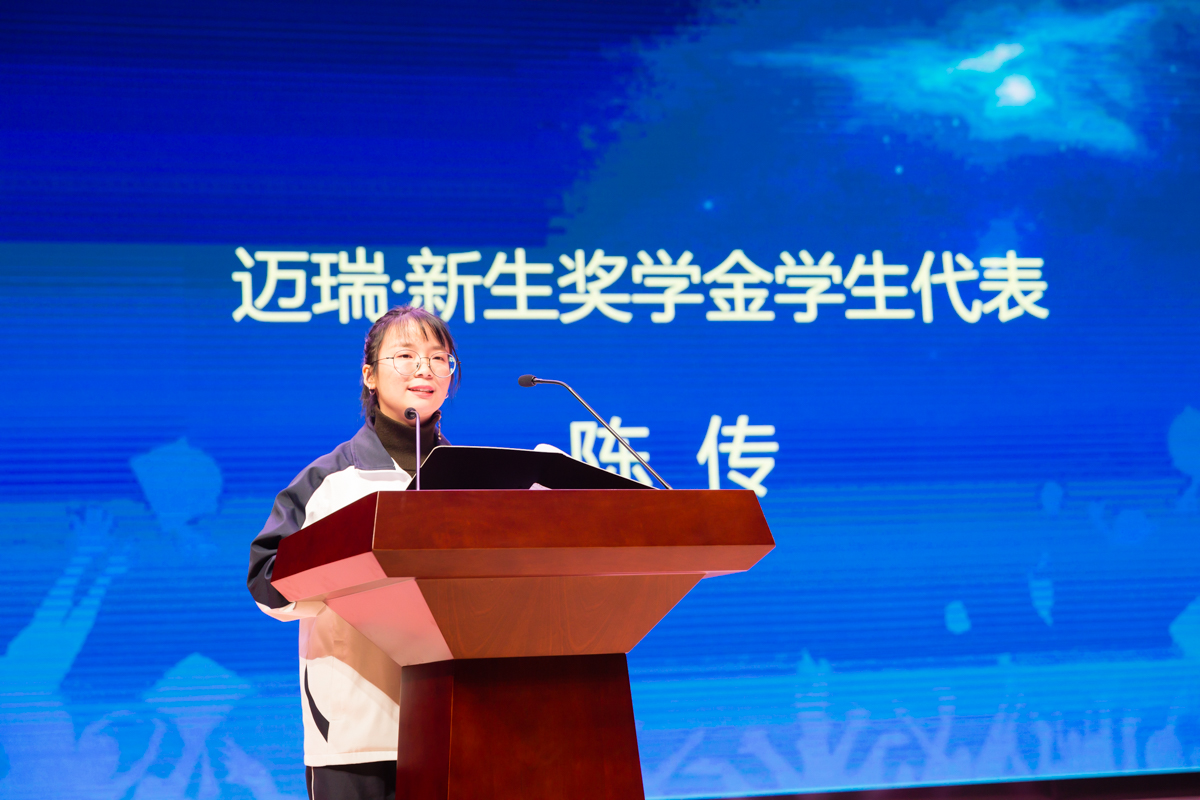 陈传同学代表获奖同学发表感言,她代表全体同学向深圳迈瑞公司表示最诚挚的感谢,感谢公司的关心和帮助。她说新生奖学金并不是最终的目标,而是前进路途中的一股动力,应正确看待这种奖励和荣誉,过去的都过去了,现在应该做的就是把握当下,严格要求自己,以积极进取之心,追求卓越,勇攀高峰。