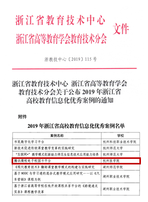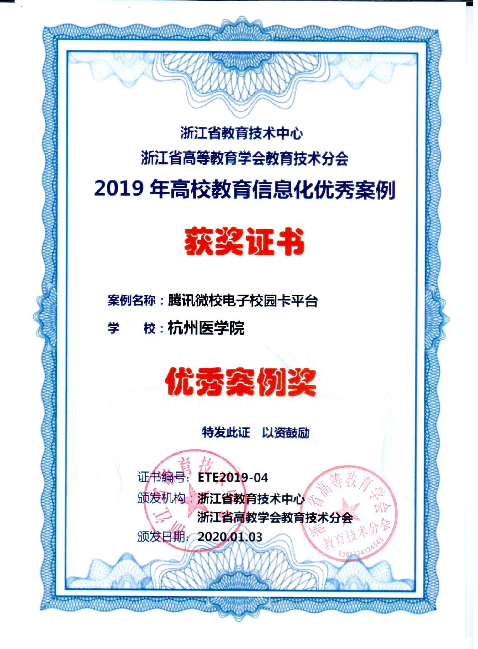 2019年12月,杭州医学院腾讯微校电子校园卡平台获得浙江省教育技术中心、浙江省高等教育学会教育技术分会“高校教育信息化优秀案例”。