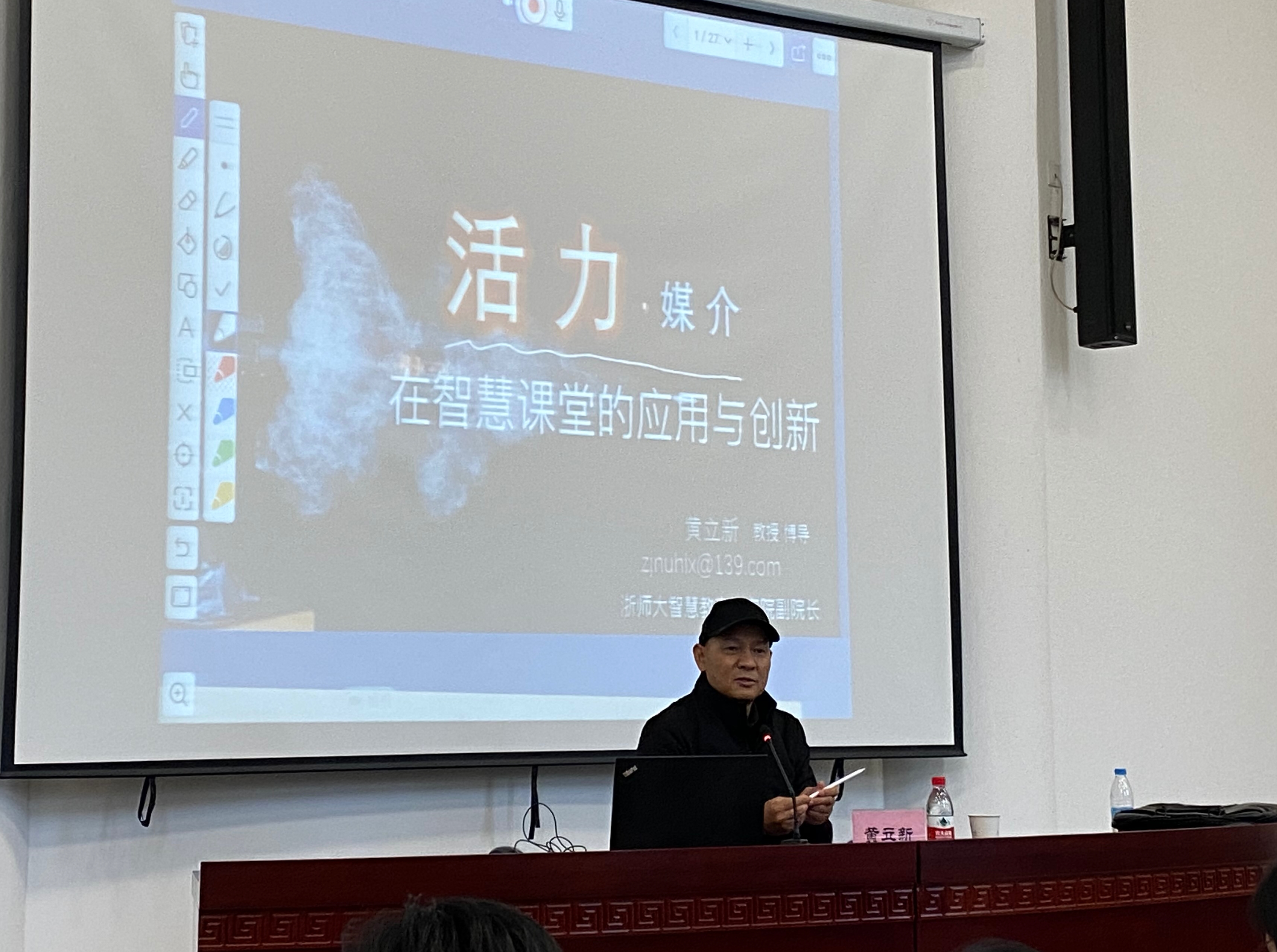 11月25日下午,教师教学发展中心邀请浙江师范大学智慧教育研究院副院长黄立新来校作“活力媒介在智慧课堂中的实践与创新”专题讲座。本次活动采取线下与线上同步直播的形式开展,40余位校内教师参加了线下讲座,另有数位教师观看了线上钉钉直播。讲座由教师教学发展中心主任周彩华主持。