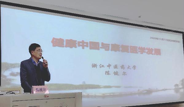 近日,临床医学院于临安校区6号楼102开展康复治疗学、康复治疗技术专业20级新生始业教育。中国康复医学会康复医学教育专委会主任委员、全国康复治疗技术专业教材建设与评审委员会主任、浙江康复医疗中心/浙江中医药大学附属康复医院顾问、学术委员会名誉主任,陈健尔教授作“健康中国与康复医学发展”主题讲座。