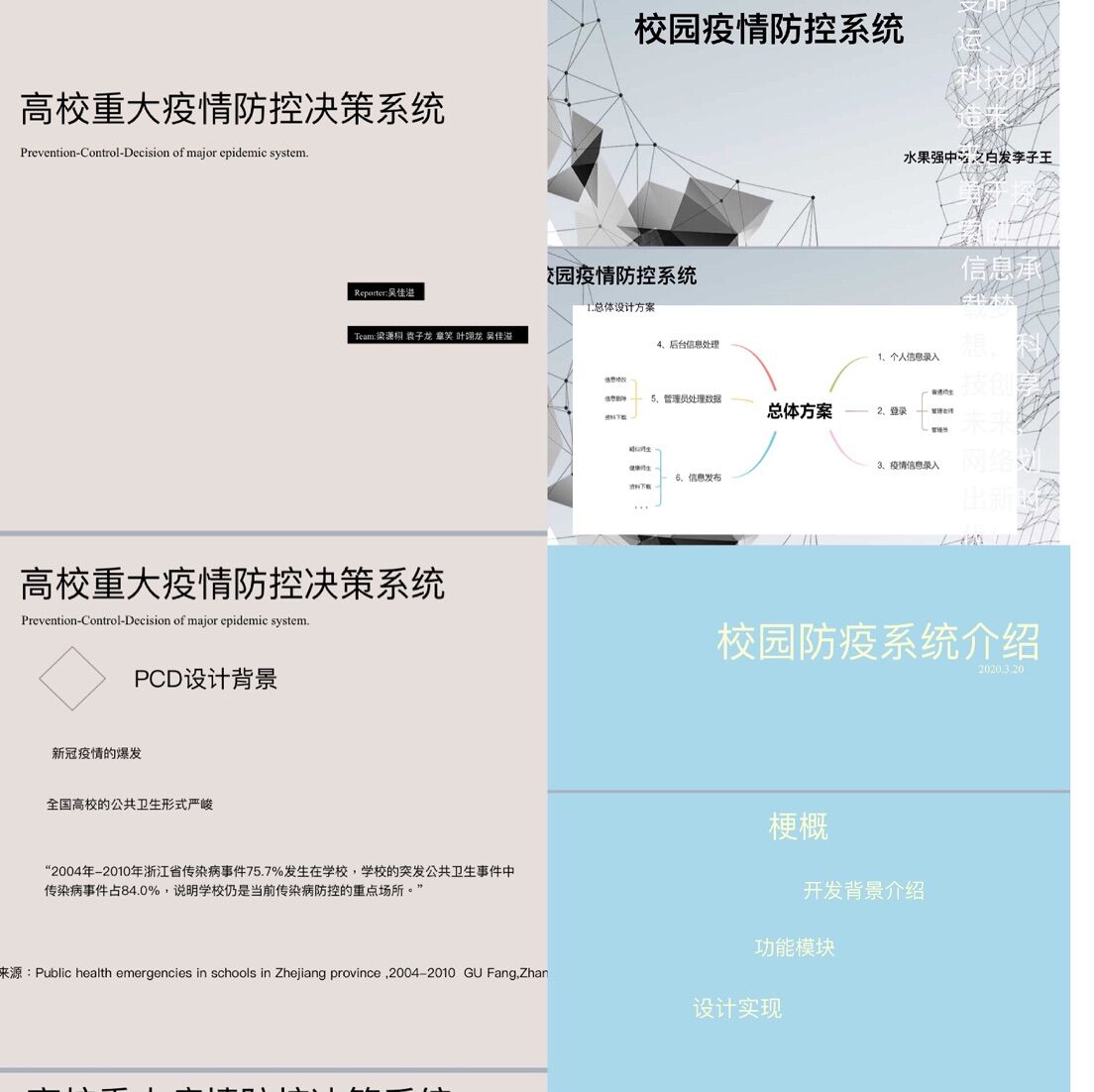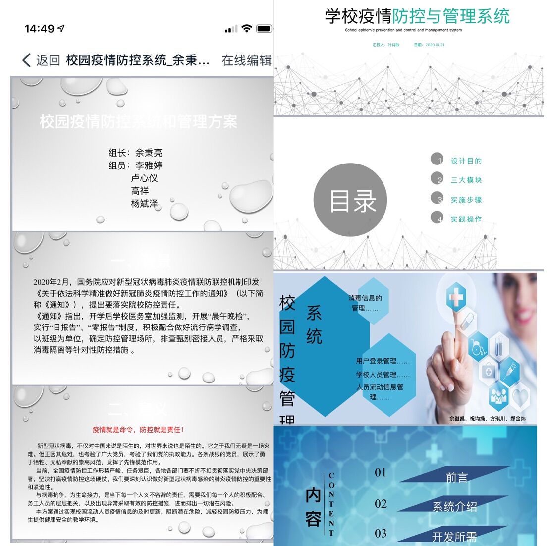 会议伊始,叶寒锋老师介绍了本次路演的规则和注意事项。本次路演共有六组同学参加,分别由郑金炜、吴佳溢、曹湘莹、叶诗敏、余秉亮和金淑芬担任组长。每位组长依次就“ 重大疫情校园管理系统” 从背景、功能模块、设计实现等来阐述系统设计方案。评委老师进行了提问,并为各组参赛方案提出了建设性意见。