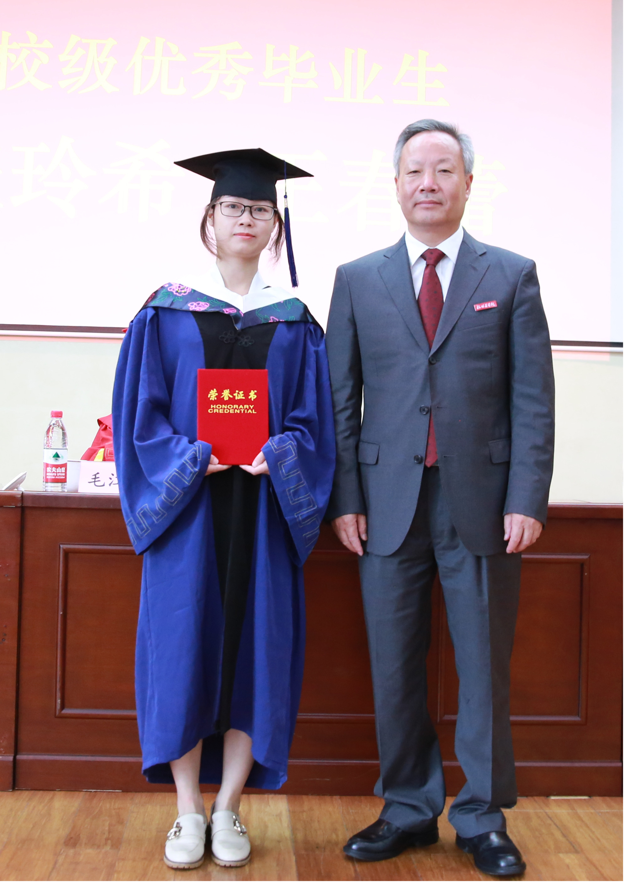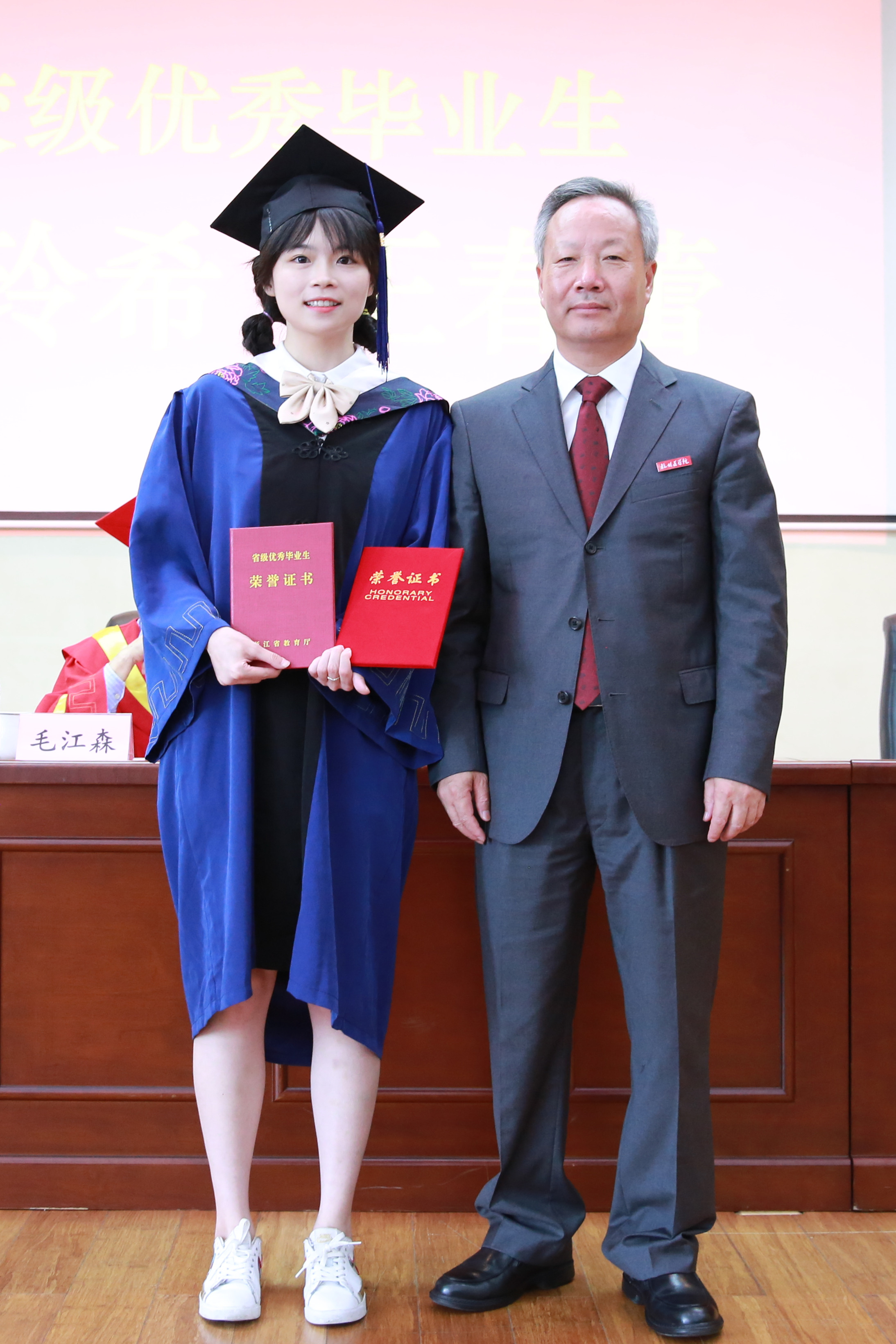 荣誉表彰环节,姜建鸿书记为研究生国家奖学金获得者(王春蕾)、浙江省优秀毕业生荣誉获得者(张玲希)、校级优秀毕业生荣誉获得者(张玲希、王春蕾)颁发了荣誉证书。