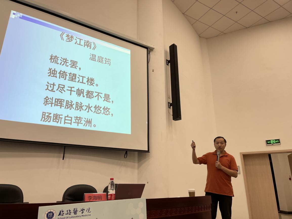 10月15日晚上,检验医学院第39期幸福书苑·阅享沙龙活动在临安校区活动中心一号报告厅举行。此次沙龙有幸邀请到杭州师范大学人文学院李海明博士,他给同学们带来了题为“数着潮涨潮平,一往情深——中外诗歌鉴赏”的讲座。检验医学院党委副书记吕霞飞、辅导员章雪妮出席本次活动,学院140多位报名的学生参加了聆听。讲座由检验医学院辅导员徐陈斌主持。