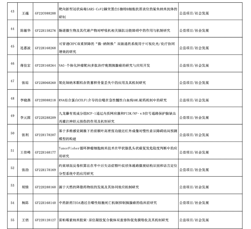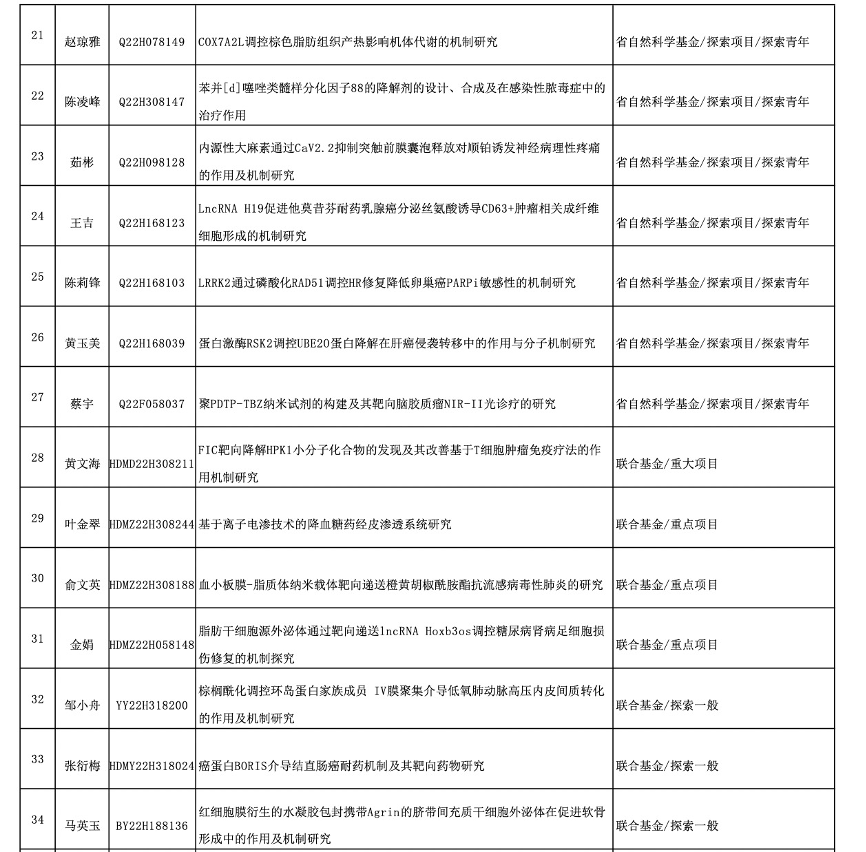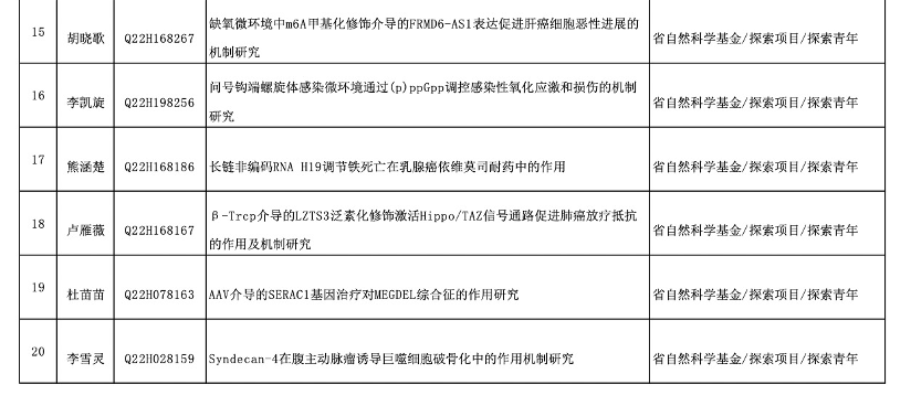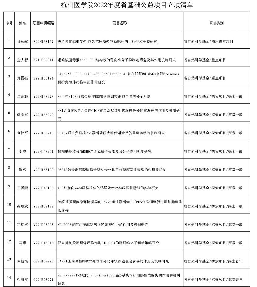 浙江省基础公益研究计划是浙江省高层次学术研究项目,代表着综合科研水平与实力。近日,浙江省科学技术厅、浙江省自然科学基金委员会发布了“关于下达2022年度浙江省基础公益研究计划项目的通知”,我校喜获63项立项资助,其中自然科学基金27项,联合基金7项,公益项目29项。杭州医学院校本部首次荣获省杰出青年项目1项。另外,省自然重点项目2项,联合基金重大项目1项,联合基金重点项目3项荣获立项,进一步体现我校科研层次的提升趋势。我校省基础公益研究计划立项数较上一年增长10.5%,批准总经费869万元,在立项总数、立项层次、资助金额上均实现了新突破。