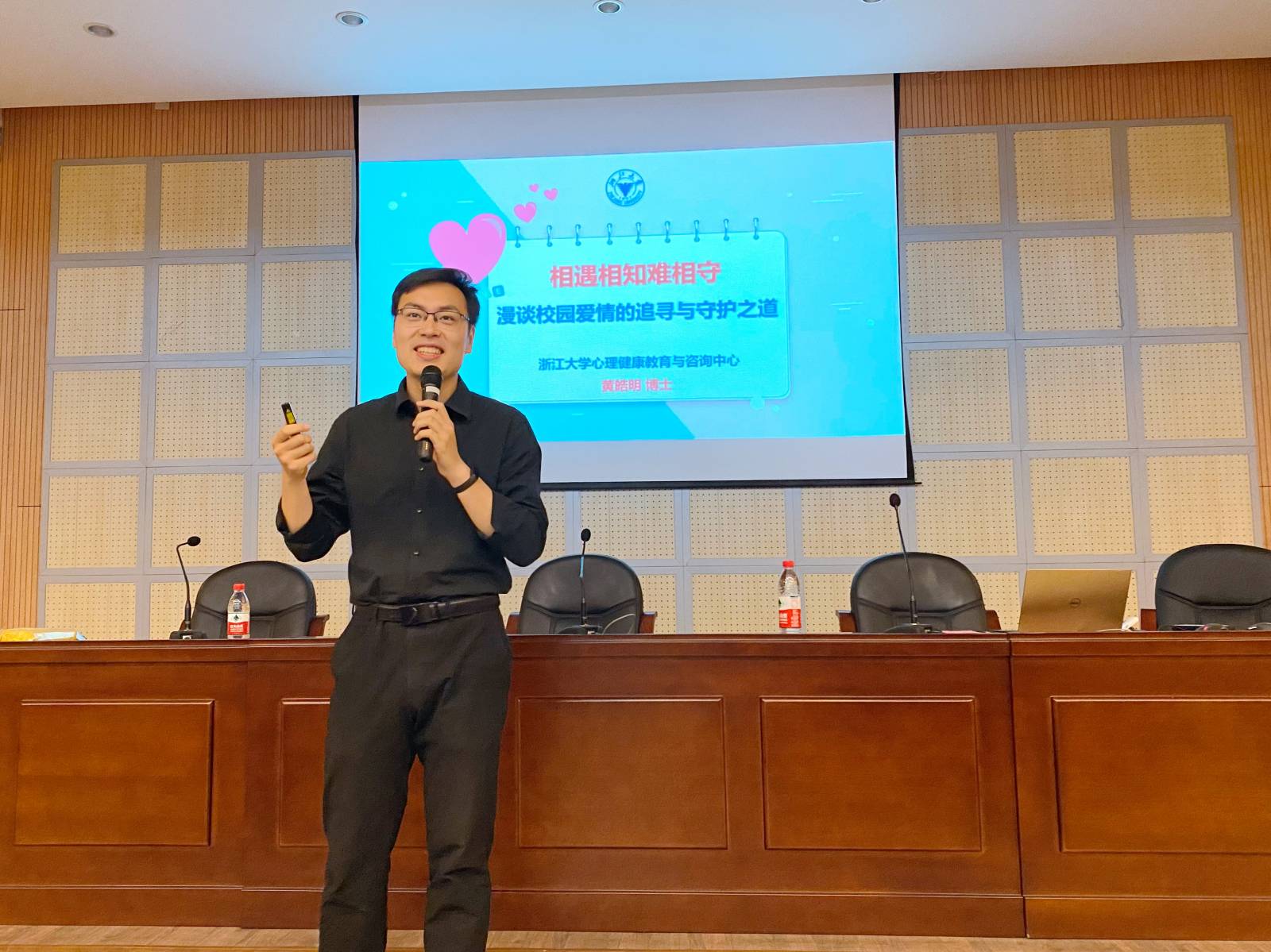 4月29日晚,杭州医学院大学生心理健康教育中心于滨江校区博爱楼K226举行了以“相遇相知难相守—漫谈校园爱情的追寻与守护之道”为主题的讲座,本次讲座邀请到了浙江大学心理健康教育与咨询中心专职教师黄皓明博士与同学们面对面探讨爱情心理学。我校专兼职咨询师及200余名同学均参加了此次讲座。