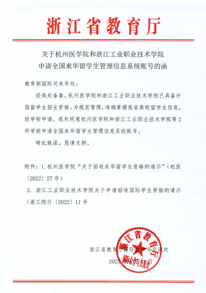2022年4月11日,经浙江省教育厅审核批准,教育部备案,杭州医学院获批来华留学生招生单位资格。