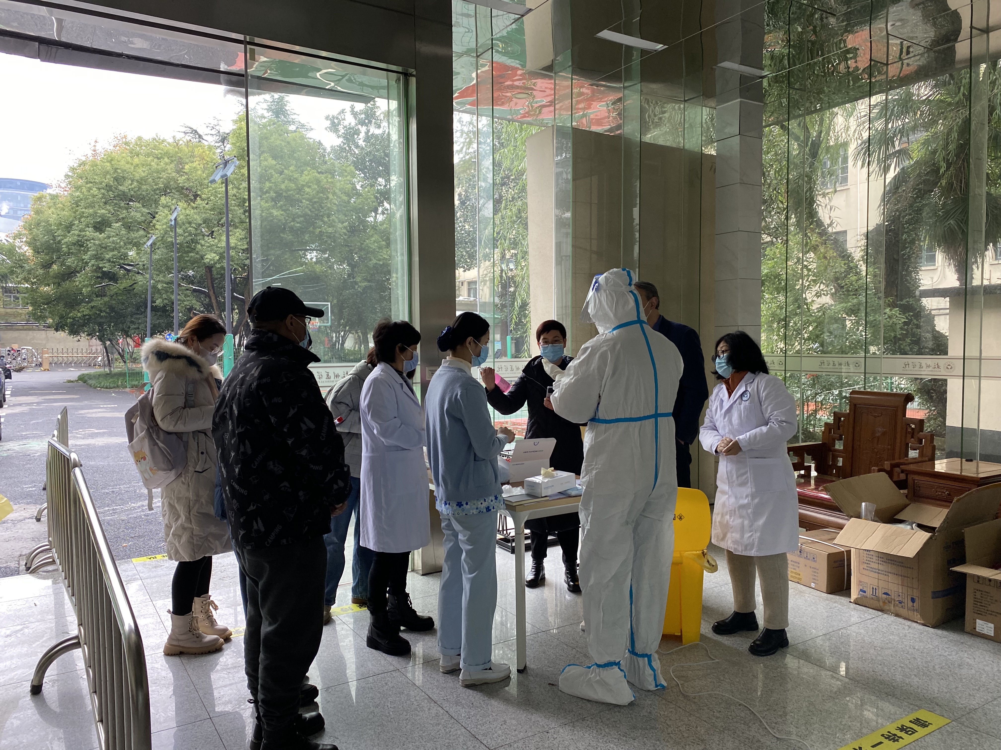 为了避免师生在校外做核酸检测的社会面交叉感染,管委会积极联系开辟校内核酸检测点,组织志愿者做核酸检测扫码、采样,加派人手在现场服务引导,积极联系为赶考学生开设单管检测。“让我上!我志愿请战!”当志愿者出现感染时,许多老师主动前来支援,还有人通过钉钉默默地把自己的名字加在志愿服务的排班表上。