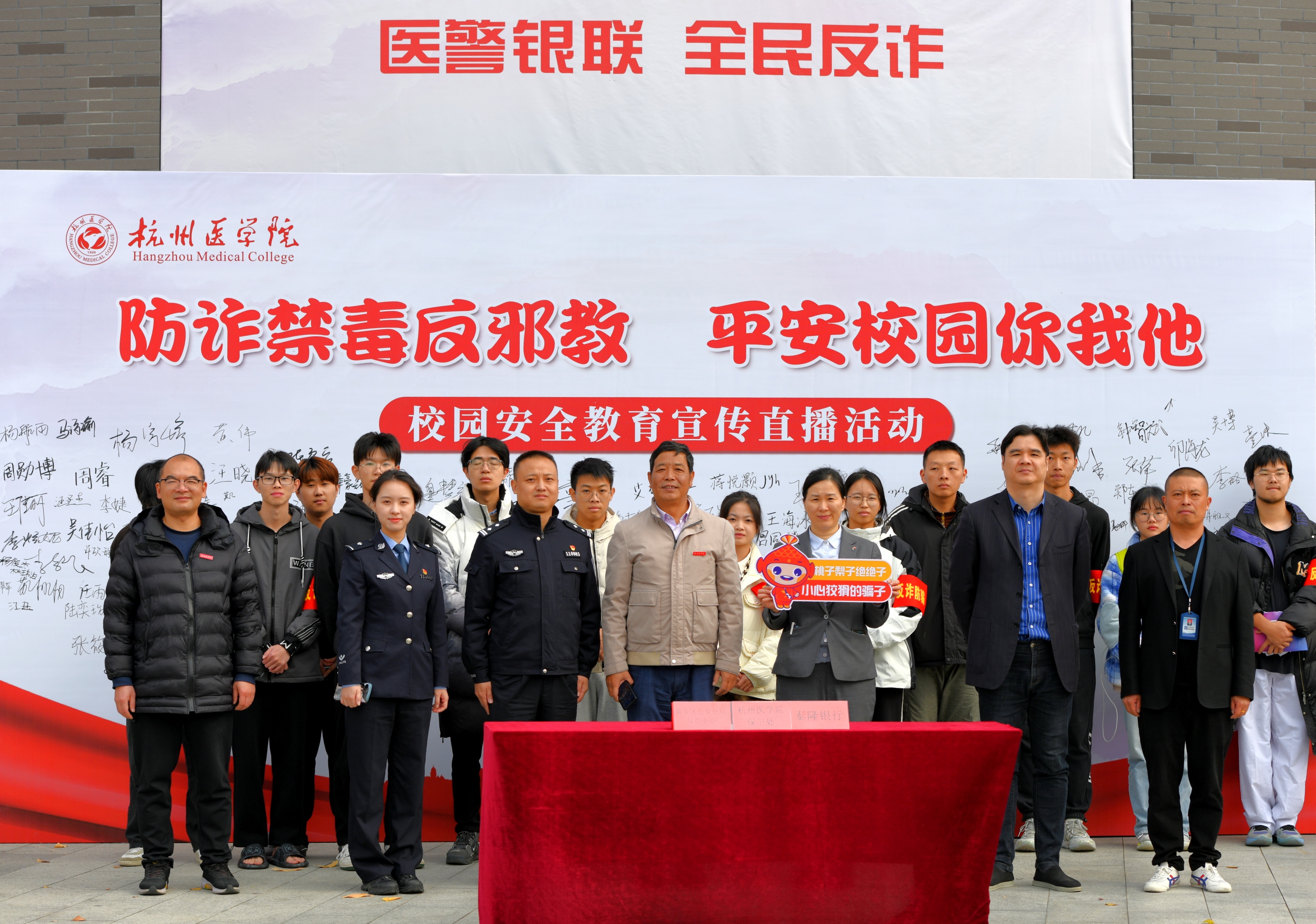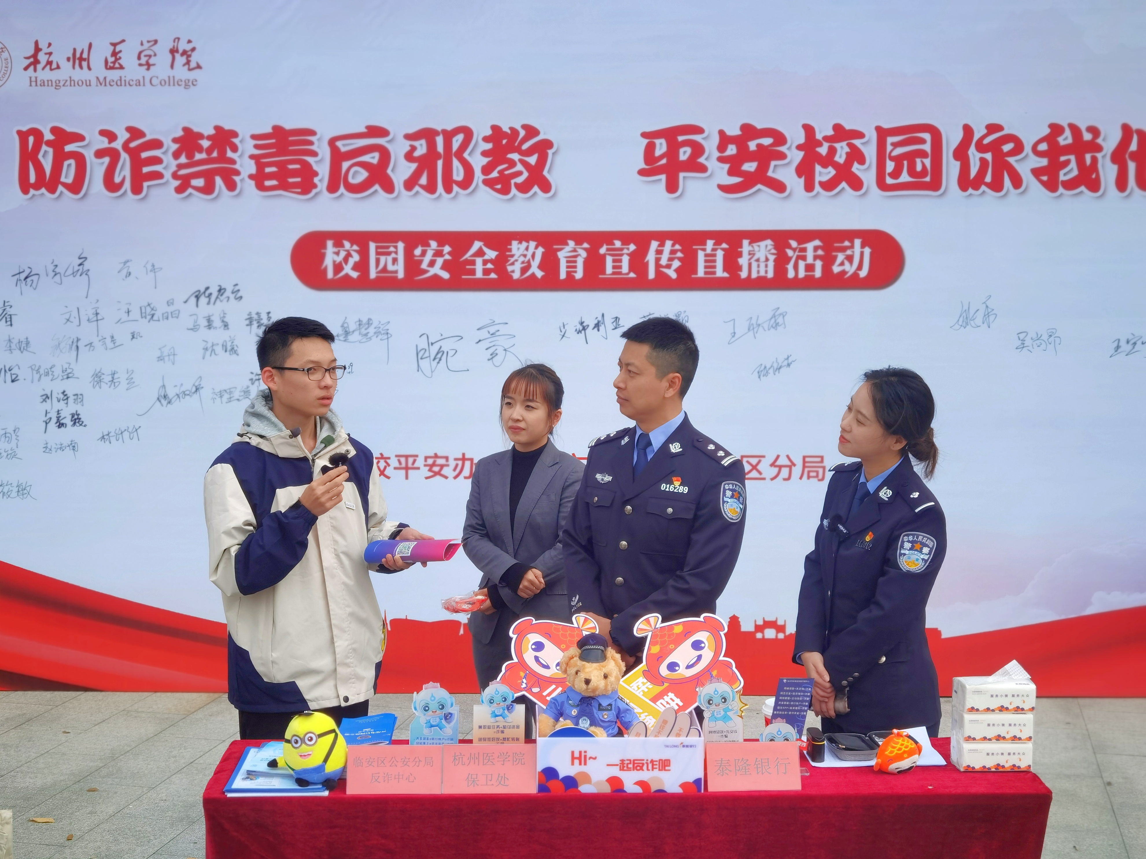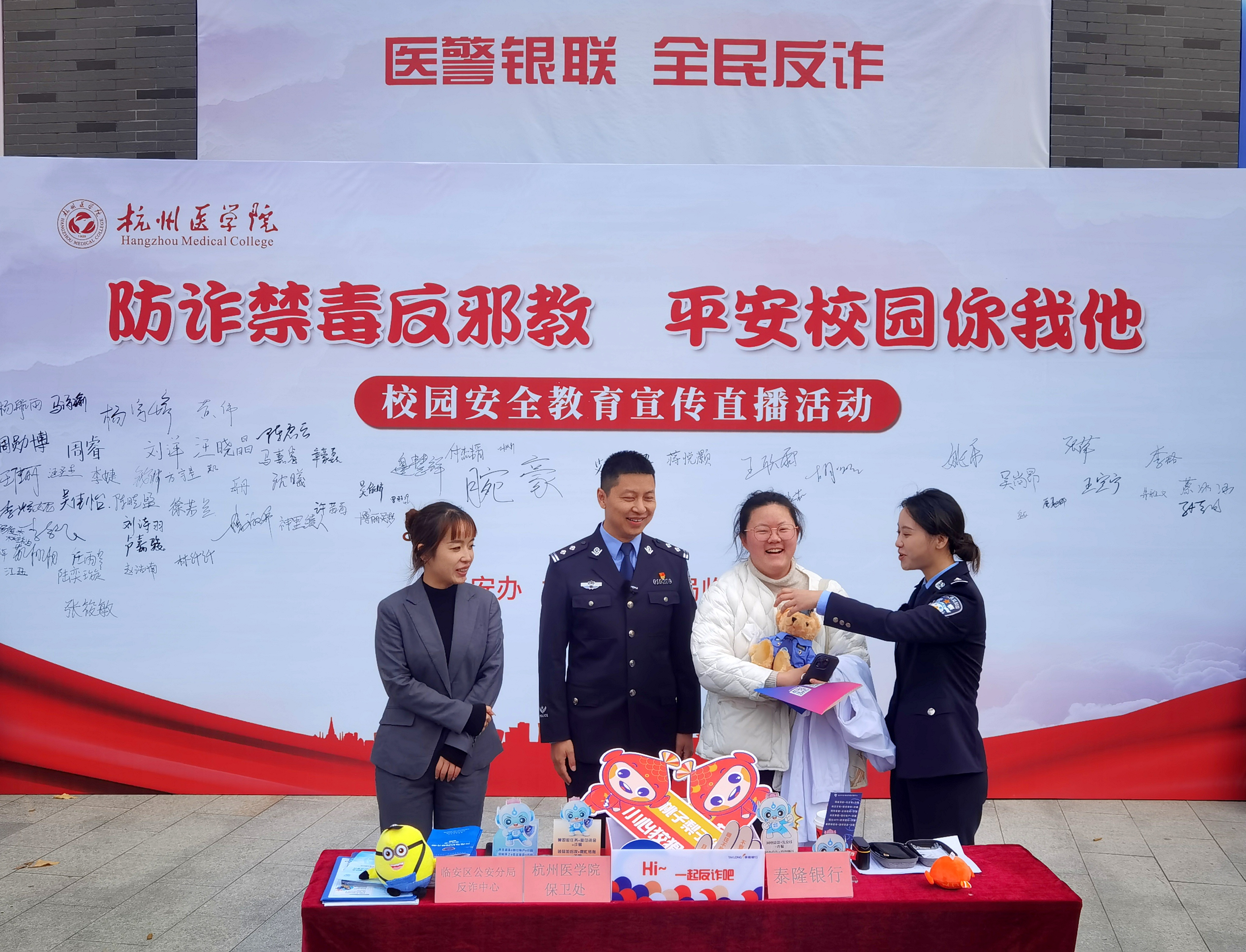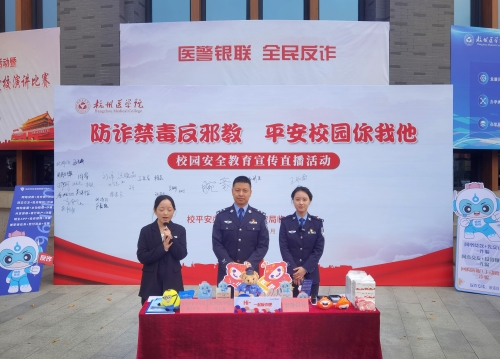 2023年11月30日,由我校平安办、临安区公安分局主办,泰隆银行临安支行协办的“防诈禁毒反邪教 平安校园你我他”安全教育宣传直播活动在临安校区美食广场隆重举行。活动邀请了杭州市公安局临安分局民警陈炯、钱晨莹作为主讲嘉宾,线上线下为广大师生筑上了一道反诈防火墙。校党委委员、副校长姚乐,校保卫处、学生处、团委负责人等一千余名师生以及临安区公安分局政保大队、反诈中心、玲珑派出所、临安区锦南街道参加了现场活动。