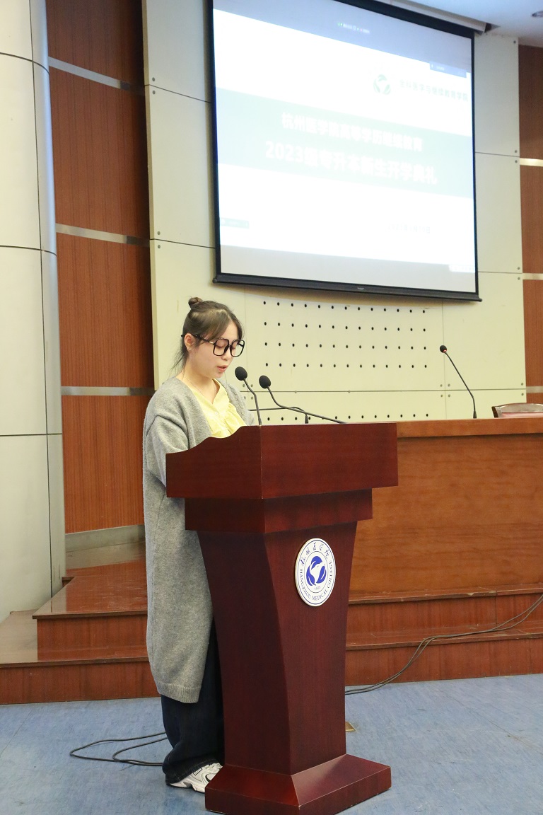 典礼上还举行了校徽佩戴仪式,在杭医优美的校歌声中,学院老师为每个专业的新生代表佩戴校徽并颁发了学生证。班主任杨慧芳老师对新同学们开展始业教育。最后现场的师生进行了合影留念,定格美好的瞬间。