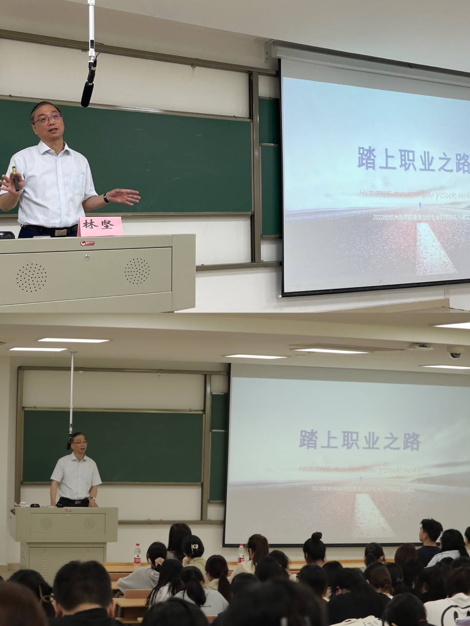 在分会场,徐琳峰副院长分别为本、专科同学上了题为“第三课堂——如何实习”的专业教育课。她重点提到了专业形象和医疗安全问题,并列出了优秀实习生应具备的素质要求。她强调:“我们应拥有三颗心——爱心、耐心、责任心;做到三动——动手、动脑、动情。”她希望所有实习生能以充沛的热情投入实习工作,铭记使命、虚心学习,为学院添光,为杭医增彩。