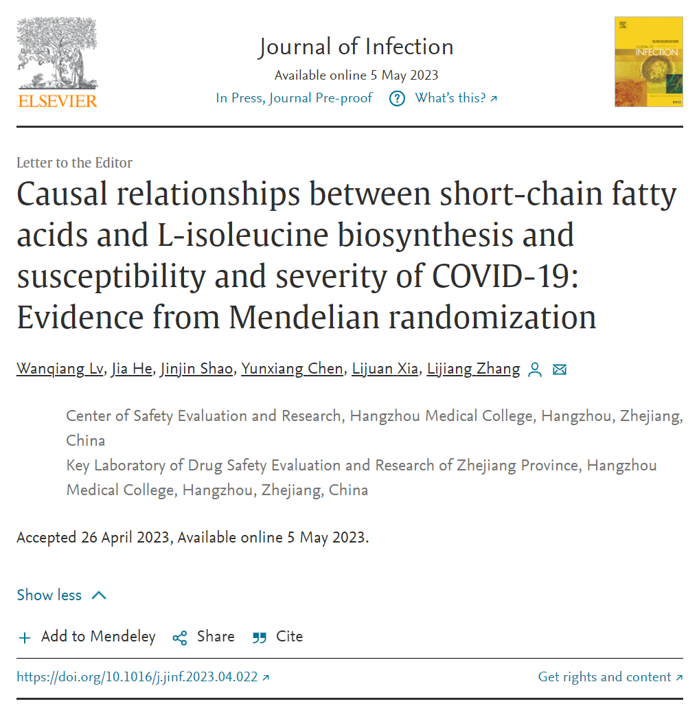 2023年5月5日,杭州医学院安全性评价研究中心(浙江省药物安全性评价技术研究重点实验室)张立将研究员课题组在国际权威期刊《JOURNAL OF INFECTION》(中科院TOP一区,IF=38.637)以Research Letter的形式在线发表题为“Causal relationships between short-chain fatty acids and L-isoleucine biosynthesis and susceptibility and severity of COVID-19: Evidence from Mendelian randomization”的研究成果,揭示了肠道菌代谢产物合成与COVID-19易感性和严重性之间的因果关系。张立将研究员为通讯作者,吕万强博士为第一作者。该论文第一单位和通讯单位均为杭州医学院。