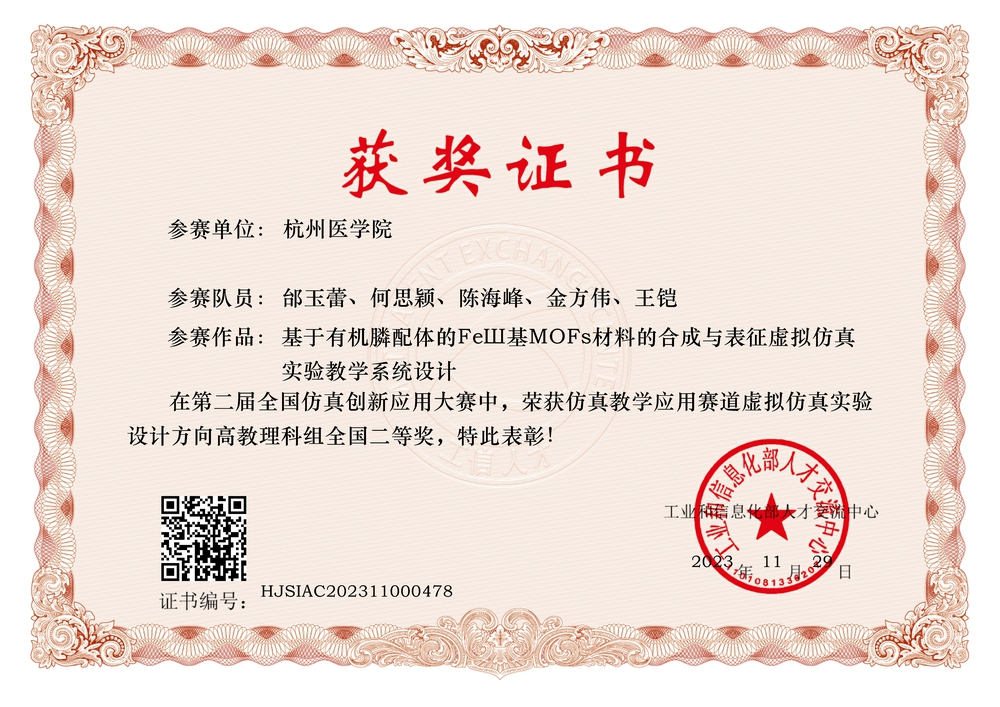 据悉,全国仿真创新应用大赛是由工业和信息化部主办的国家级赛事,旨在将仿真行业发展需求融入教学过程,促进仿真技术应用方向的校企共建,助力我国仿真产业快速发展。邰玉蕾老师指导的参赛作品为《基于有机膦配体的Fe(Ш)基MOFs材料的合成与表征虚拟仿真实验》(指导教师:邰玉蕾、何思颖;企业指导教师:陈海峰;团队学生:金方伟、王铠)。该项目基于应用-组成结构-合成-表征这一脉络主线设计的虚拟仿真系统,可以完整快速地学习Fe(Ш)基MOFs材料在高压环境下组成设计、合成条件与性能这一关键性技术。