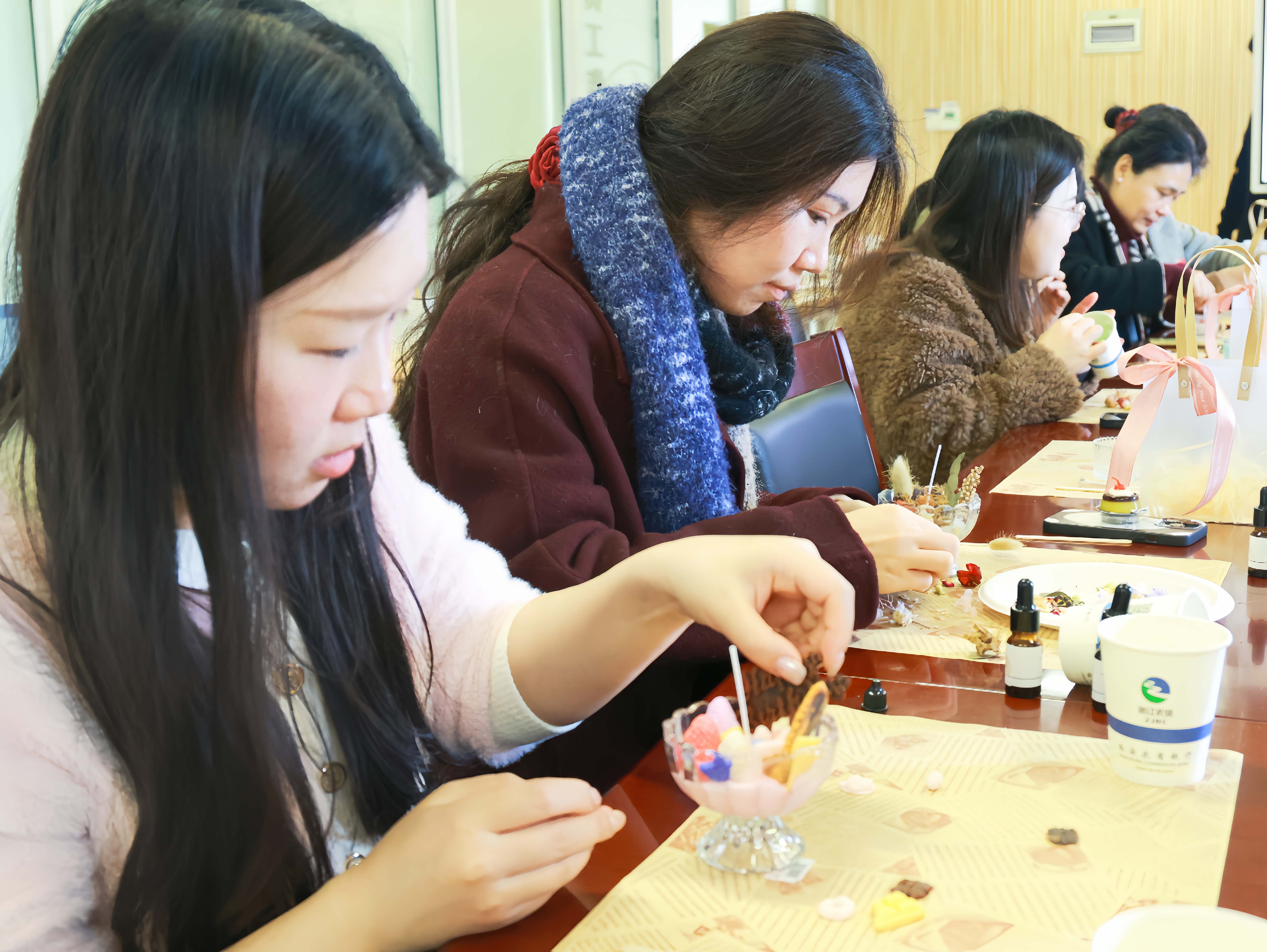 此次活动邀请了香薰制作师现场开展操作指导。每位参与者都充分发挥了自己的创意和想象力,精心挑选香薰精油、调配色彩、设计插花,每一款香薰蜡烛杯都散发着独特的气息,展现出辅导员们特有的审美韵味和创造力。在此过程中,辅导员们互相交流心得、分享技巧,提高动手能力的同时更增进了彼此间的友谊。