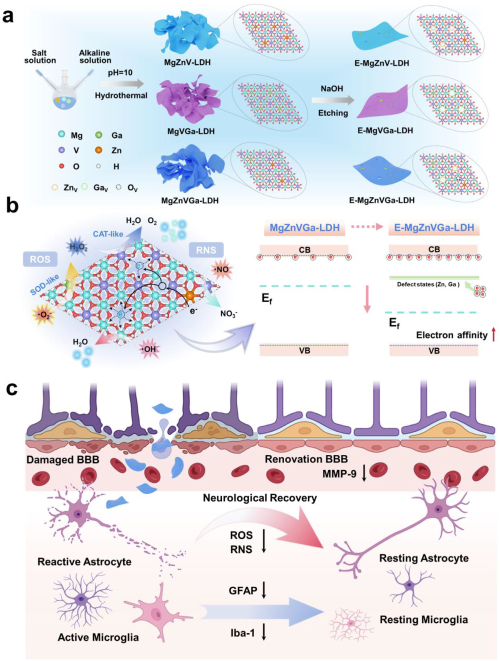 图形摘要 a) E-MgZnVGa-LDH合成路线;b) ROS/ RNS清除模拟酶的酶学能力;c) E-MgZnVGa-LDH在缺血性脑卒中再灌注损伤中的治疗机制。