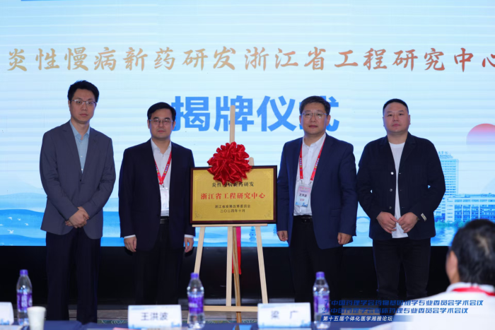 在揭牌环节,中国药科大学副校长杨勇、杭州医学院校长梁广、杭州百诚医药研究中心总经理王博、温州医科大学唐启东教授共同为“全省炎性慢病药物发现与安评技术研究重点实验室”揭牌。