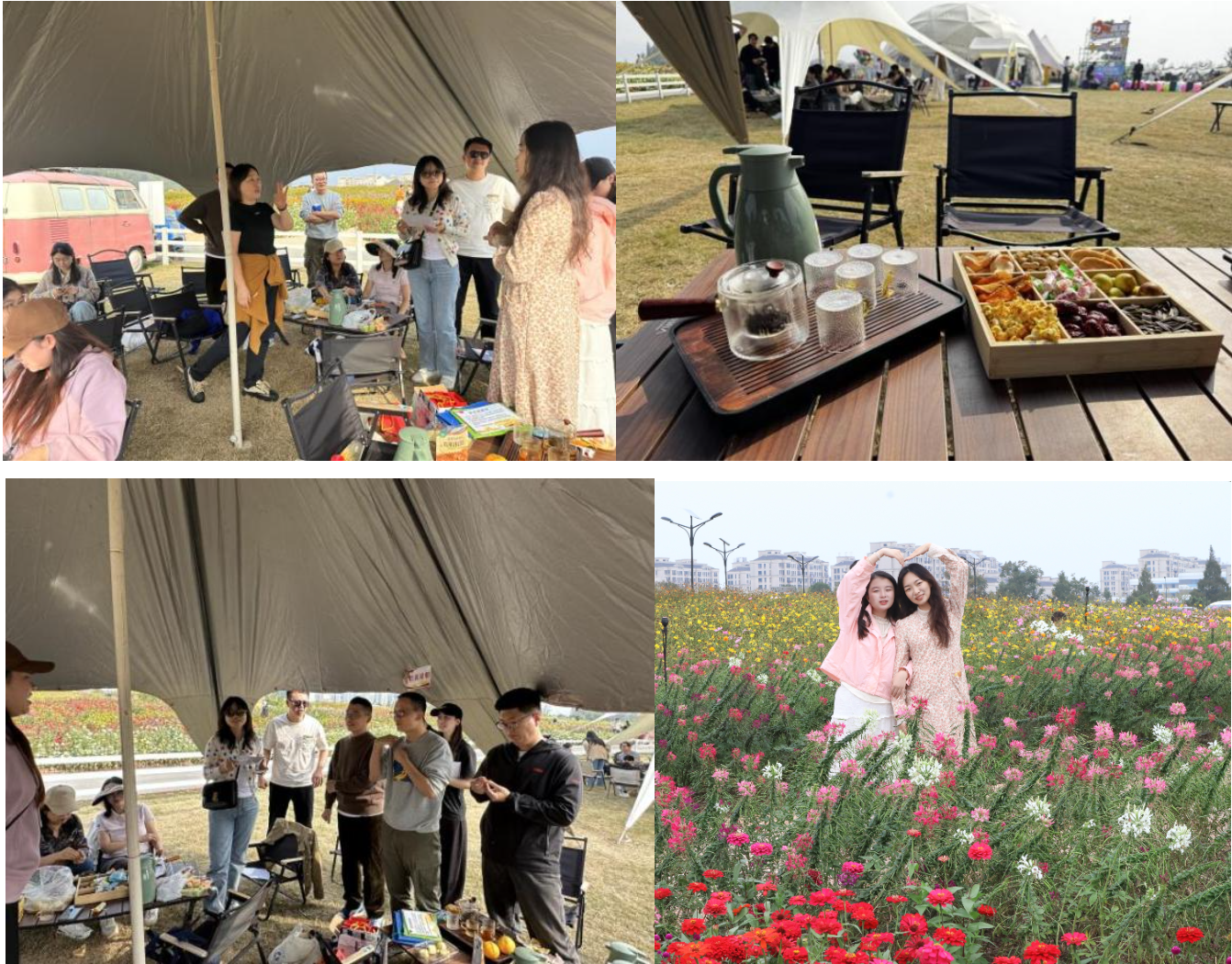 午后,抵达铜鉴湖花海,体验搭天幕、品香茗的环节,大家在秋日暖阳下,面朝广阔花海,享受湖畔茶歇时光。工会将知识竞赛与趣味互动游戏相结合,现场欢声笑语,掌声不断。稍事休息后,老师们信步走入150亩的缤纷花海。硫华菊、波斯菊、百日草、向日葵等花卉正绚烂绽放。大家漫步于花间小径,登高远眺,看湖光山色与漫山遍野的秋花交织成一幅壮丽的田园画卷。