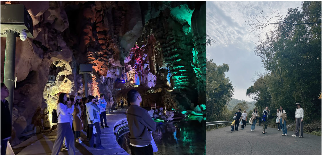 活动的首站,来到了被誉为“西湖边第一洞天”的杭州灵山幻境景区。步入洞内,宛如进入一个与世隔绝的奇幻世界。开阔的洞厅中,历经亿万年演化而成的石钟乳、石笋、石幔千姿百态,在现代化灯光的巧妙映衬下,更显绚丽梦幻,色彩斑斓。老师们在这座天然地下艺术宫殿中,或驻足欣赏,或拍照留念,无不感叹于大自然的鬼斧神工与造物之奇。