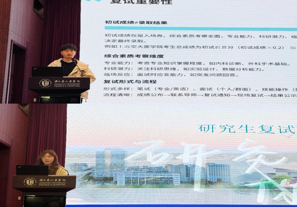 临床医学院2025届考研上线率为76.54%,较去年提升20%,这份成绩单印证了2025届毕业生们的拼搏与坚持。为提升学生考研复试竞争力,3月6日下午,临床医学院在附属人民医院学术报告厅成功举办考研面试专项培训会。会议特邀附属人民医院内科学导师、科研部副主任叶潇,温州医科大学专硕研究生、附属人民医院学员委员会主席陈泽琪,杭州医学院学硕研究生、研究生附属人民医院学员委员会生活服务部部长陈欣欣担任主讲嘉宾,临床医学院副院长郑小卫出席并作总结发言,150余名备战考研复试的学子线上线下同步参与活动。