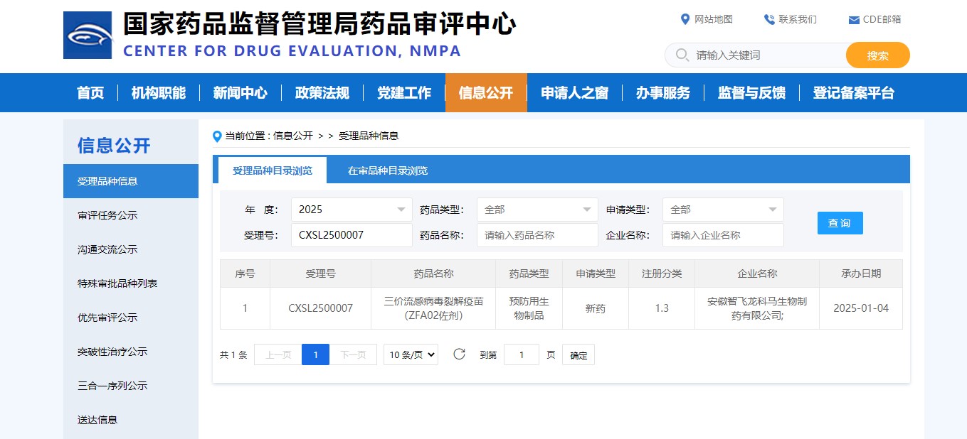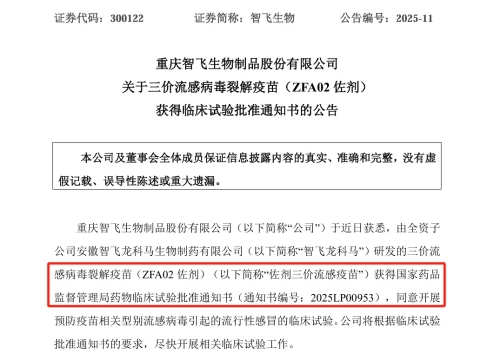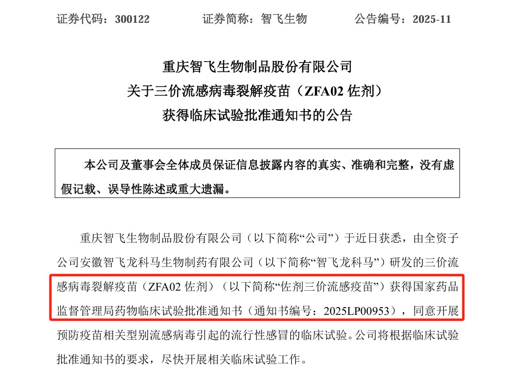 2025年4月1日智飞生物(300122.SZ)发布公告,由全资子公司安徽智飞龙科马生物制药有限公司研发的三价流感病毒裂解疫苗(ZFA02佐剂)(以下简称“佐剂三价流感疫苗”)获得国家药品监督管理局临床试验批准通知书(通知书编号:2025LP00953),同意开展预防疫苗相关型别流感病毒引起的流行性感冒的临床试验。