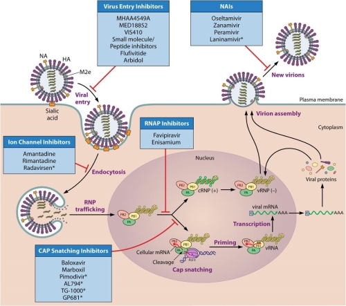 流感病毒生命周期和抗流感药物作用部位示意图[2]