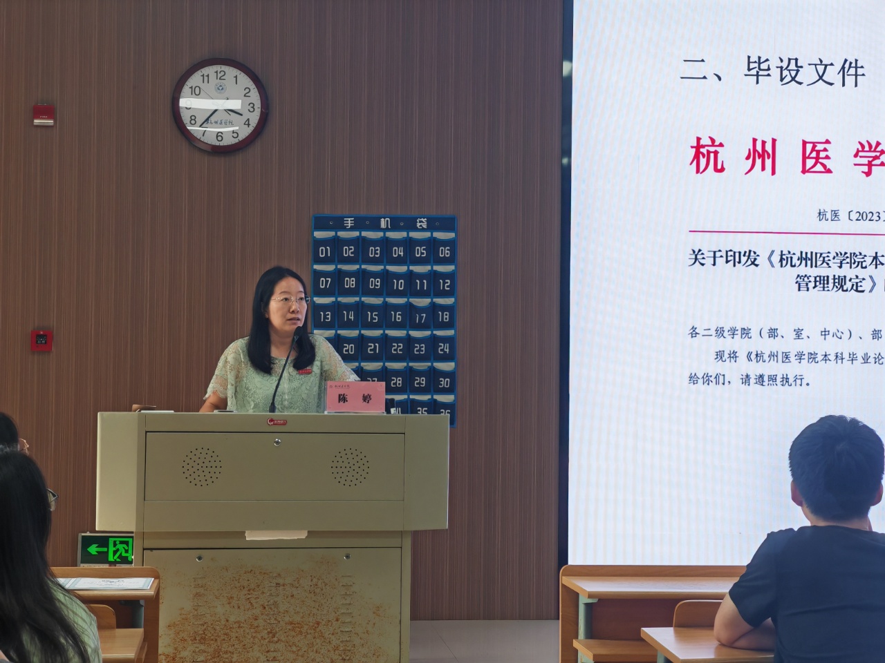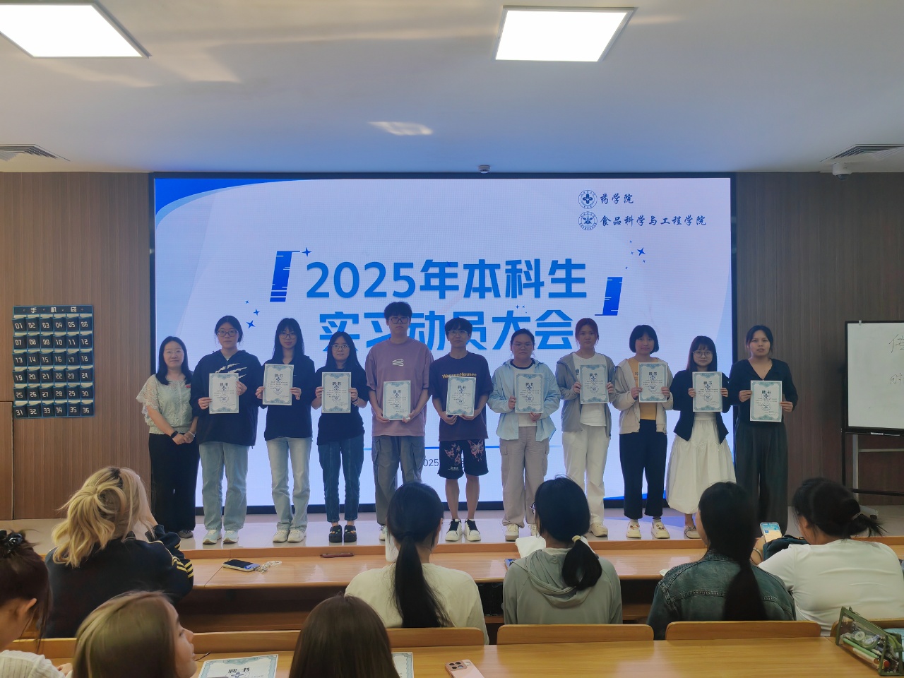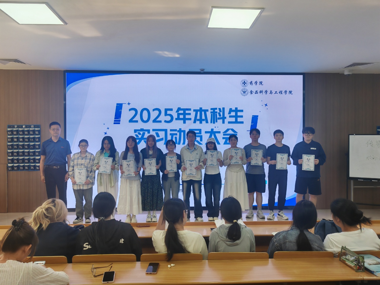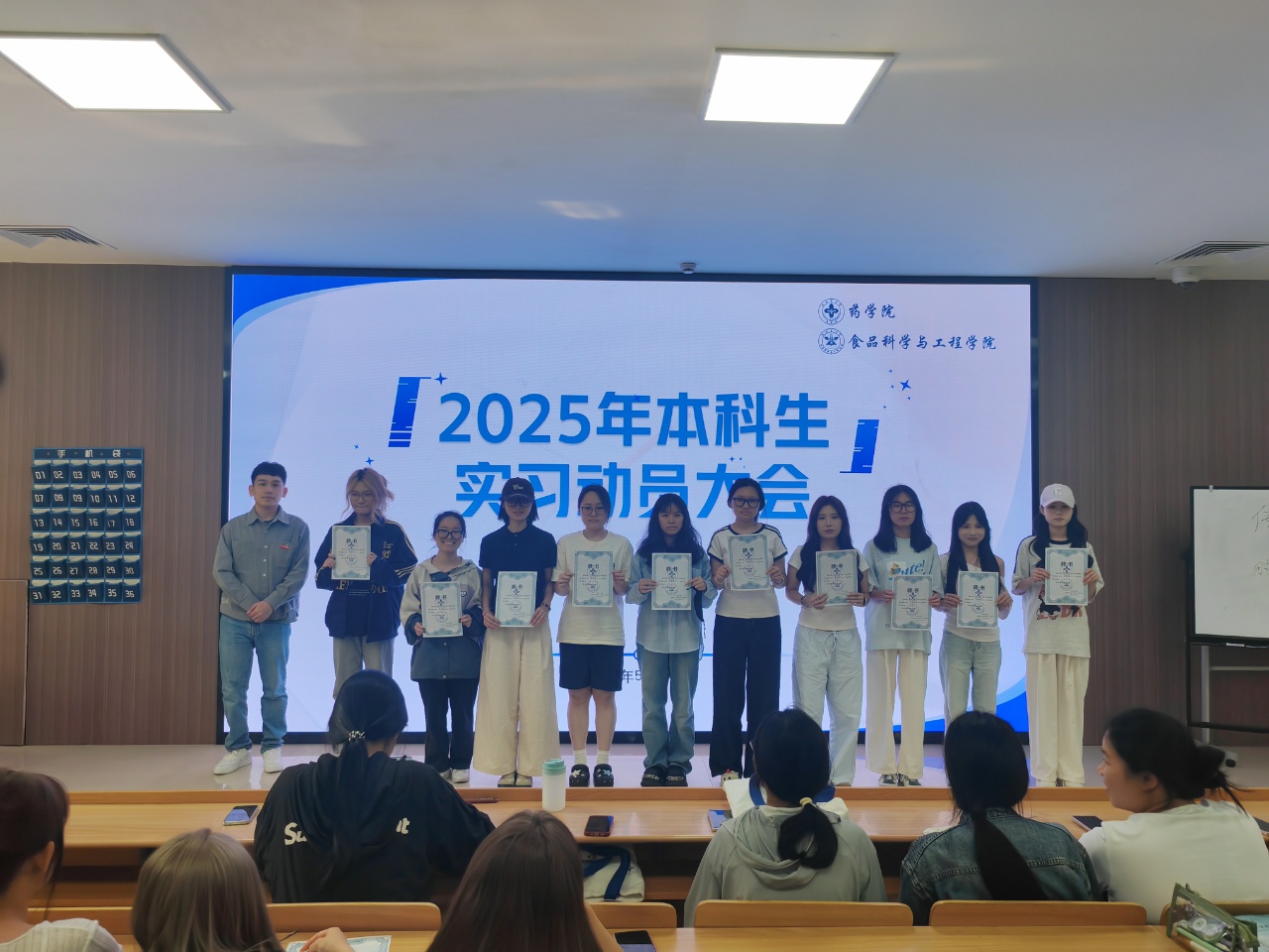 为做好2026届本科学生的实习毕设相关工作,规范实习流程,明确实习要求,提升实习质量,药学院、食品科学与工程学院于5月27日在临安校区6号楼召开了本科生实习动员大会,药学院、食品科学与工程学院党委副书记吴海华老师、本科专业负责人陈婷老师、学院辅导员老师出席会议,全体实习生参会。